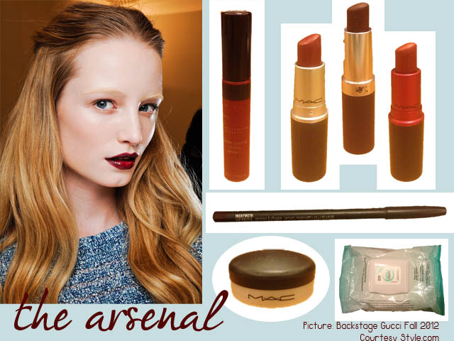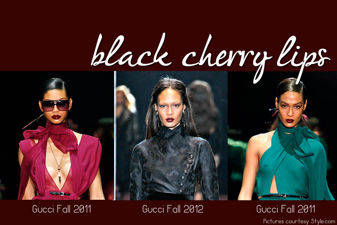 So as I mentioned in a previous post, not only were dark lips all over the Fall 2012 runways, a very SPECIFIC shade of black cherry is the most appropriate to go along with all the leather and oxblood we’re supposed to be wearing this season. Don’t believe me? Gucci did it two Falls in a row.