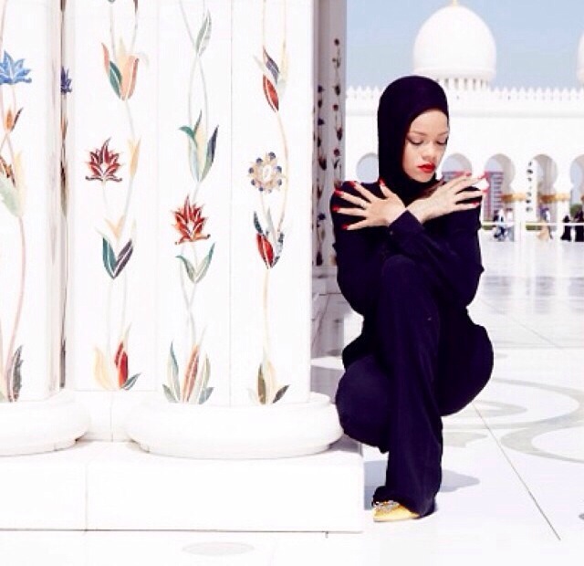 Riri’s in Abu Dhabi, and while there, her photographers, Steven Gomillion and Dennis Leopuld, shot a stunning series of photos of her posing in front of the world’s largest mosque, the Sheikh Zayed Mosque. In the pics, Ri appears conservatively covered from head-scarf to jumpsuited toe.