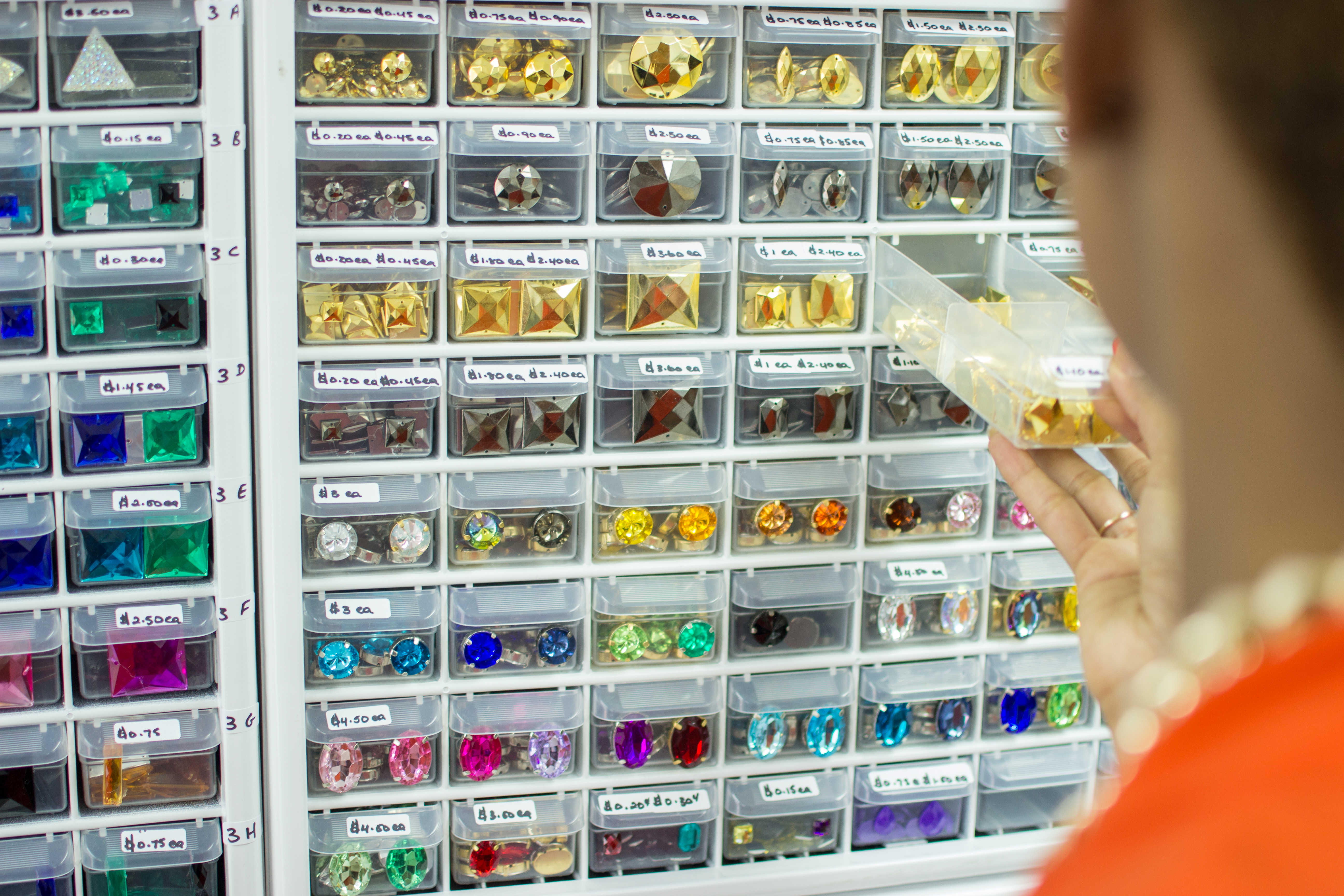 Instead, I was busy working on a friend’s Monday wear. Thank God for Featheration Motif. The new trim store opened in the middle of February on Bournes Road in St. James. It stocks a great selection of trims and a SUPER extensive variety of gems in a spectrum of colours and styles that will either render you completely inspired or completely overwhelmed. Luckily the store also boasts great organization in a clean space and helpful and friendly staff, led by proprietor Tisha Neilson, who never complain about their painstaking efforts counting out gems for you (me). They’re open year round but definitely keep them in mind for Carnival 2015.
