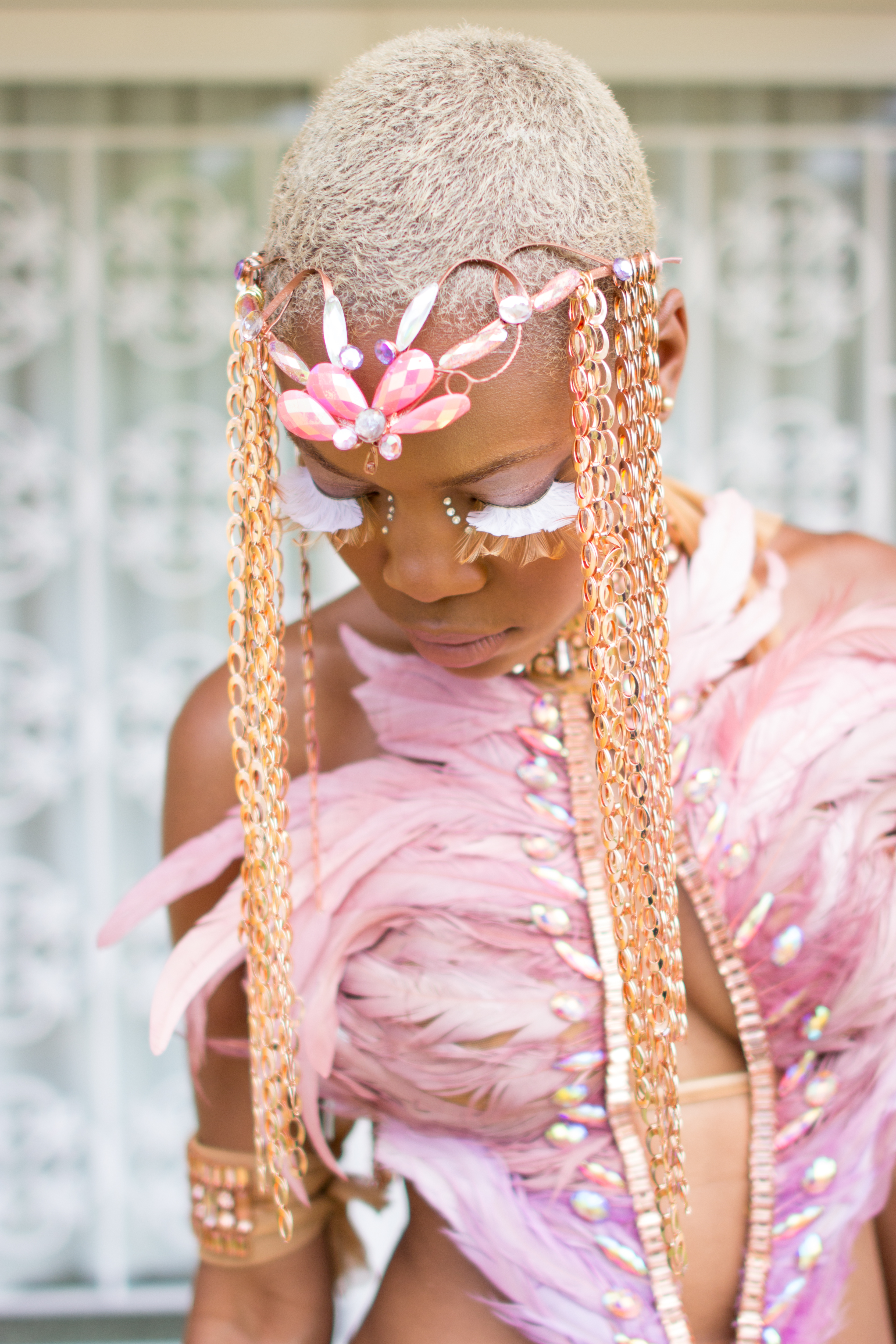 The colours of my costume were inspired by the pastel peaches, pinks and purples of the gorgeous foil fabric used in Anya Ayoung Chee’s Cheyenne costume. I played off of this with peach and rose gold trims and chains and lots of fantastic gems. Lisa and Anya both helped me mastermind construction of the costume with extremely helpful hints along the way (“I need to add another ring here for support”, “Sew the feathers to this seam for the angle you want” etc.) to help me bring the design ideas to life.