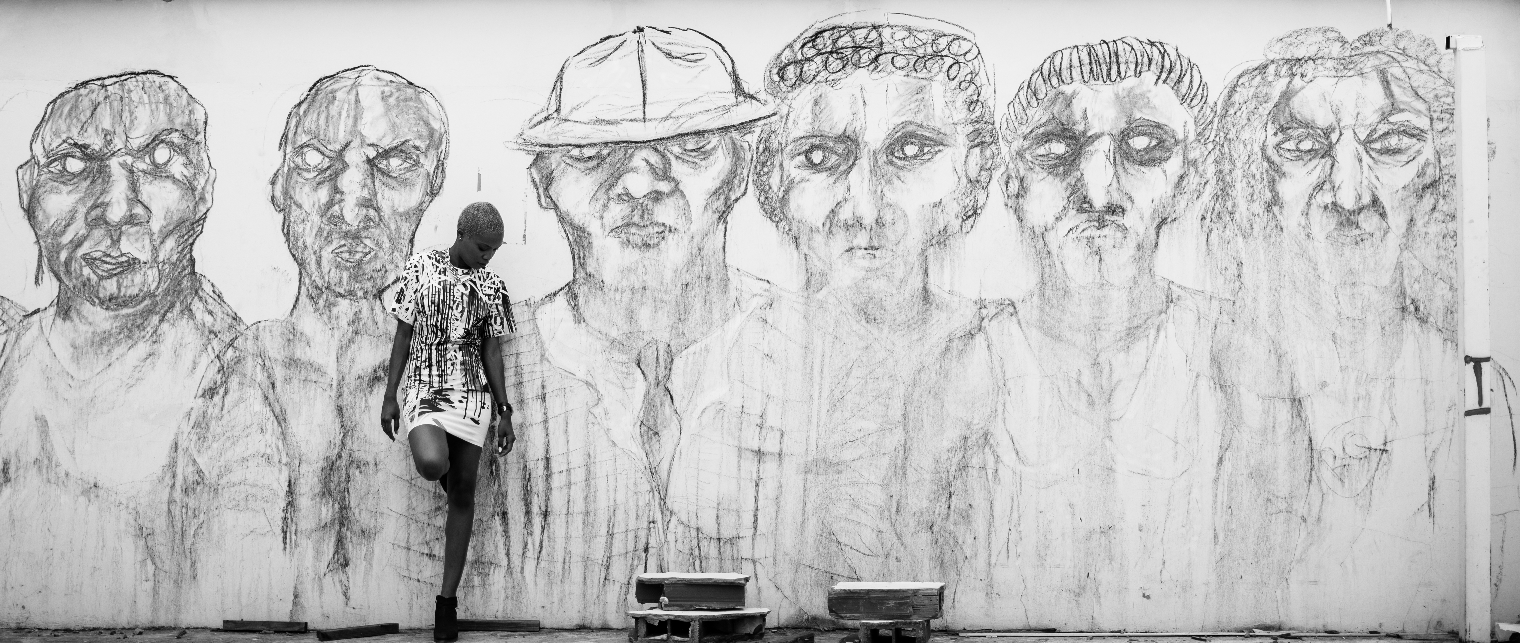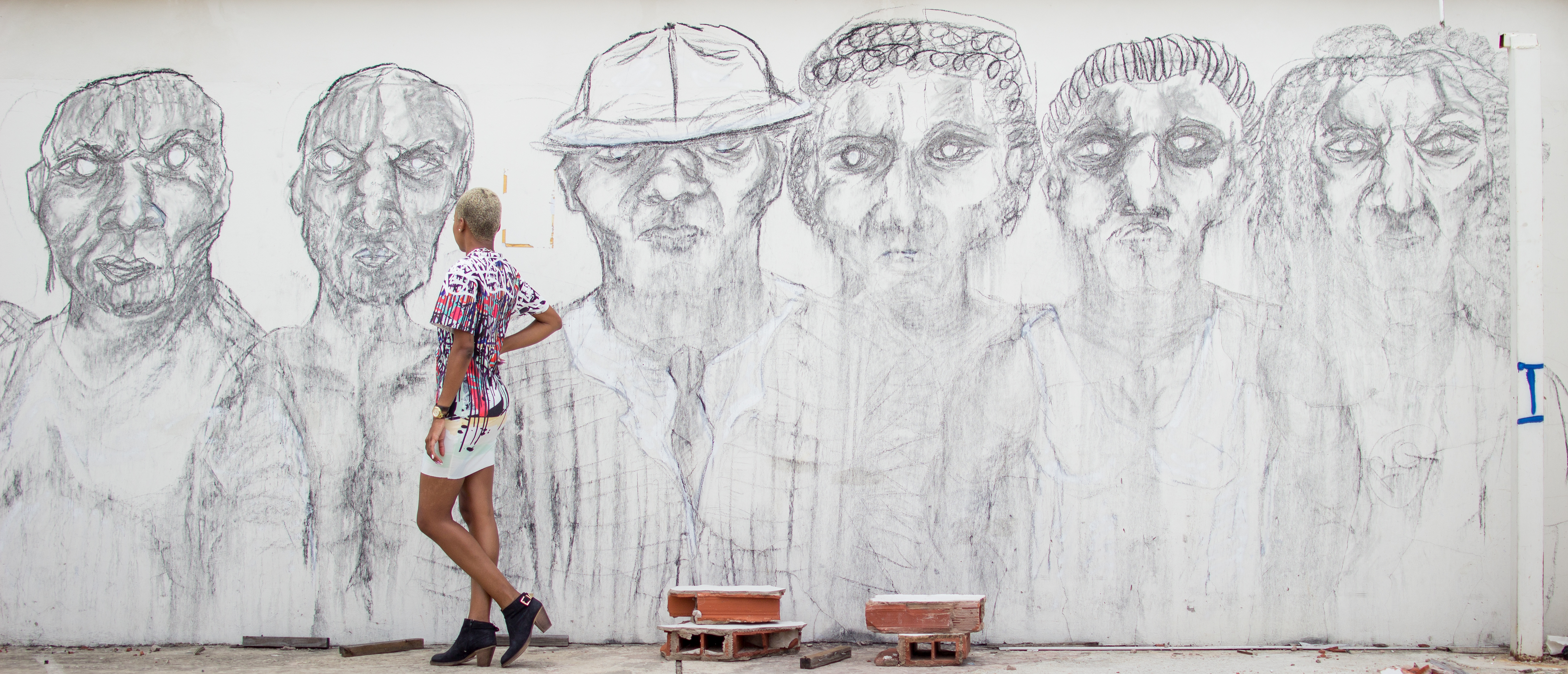 I was walking to my car from a restaurant and was literally arrested by these charcoal (?) drawings of faces on a wall in the veritable ruins of an old Newtown house (foundation, fence and front steps are all that’s left). It was really the first time I’d seen street art in which the images looked so decidedly and unapologetically Caribbean. I couldn’t wait to come back to shoot with “the boys” (do you get it? It’s like they’re my friends…that’s why I’m waving lol). And of course put on my new grafitti dress (isn’t this the most literal outfit you can imagine! lol. No points for creativity for me here).