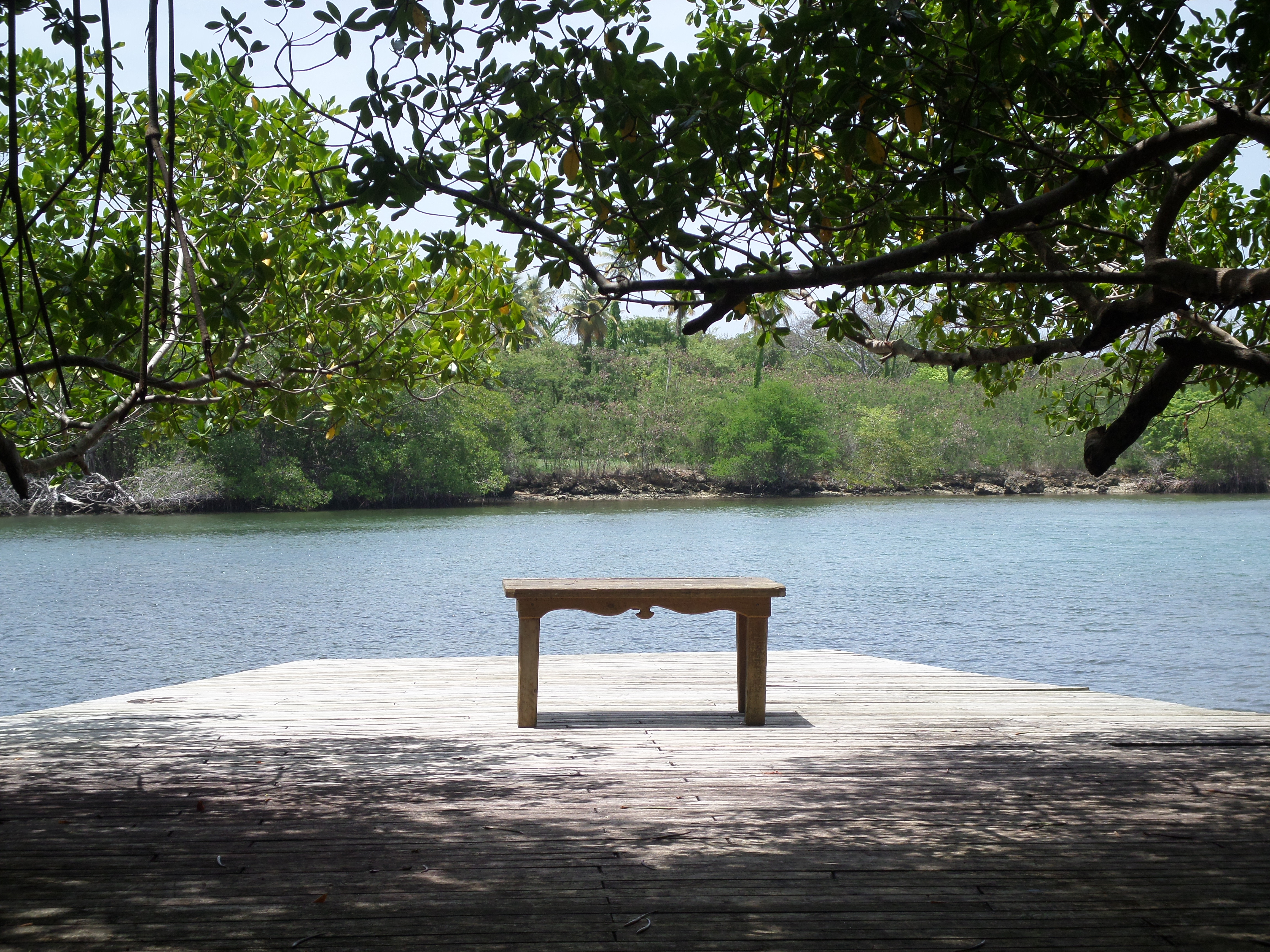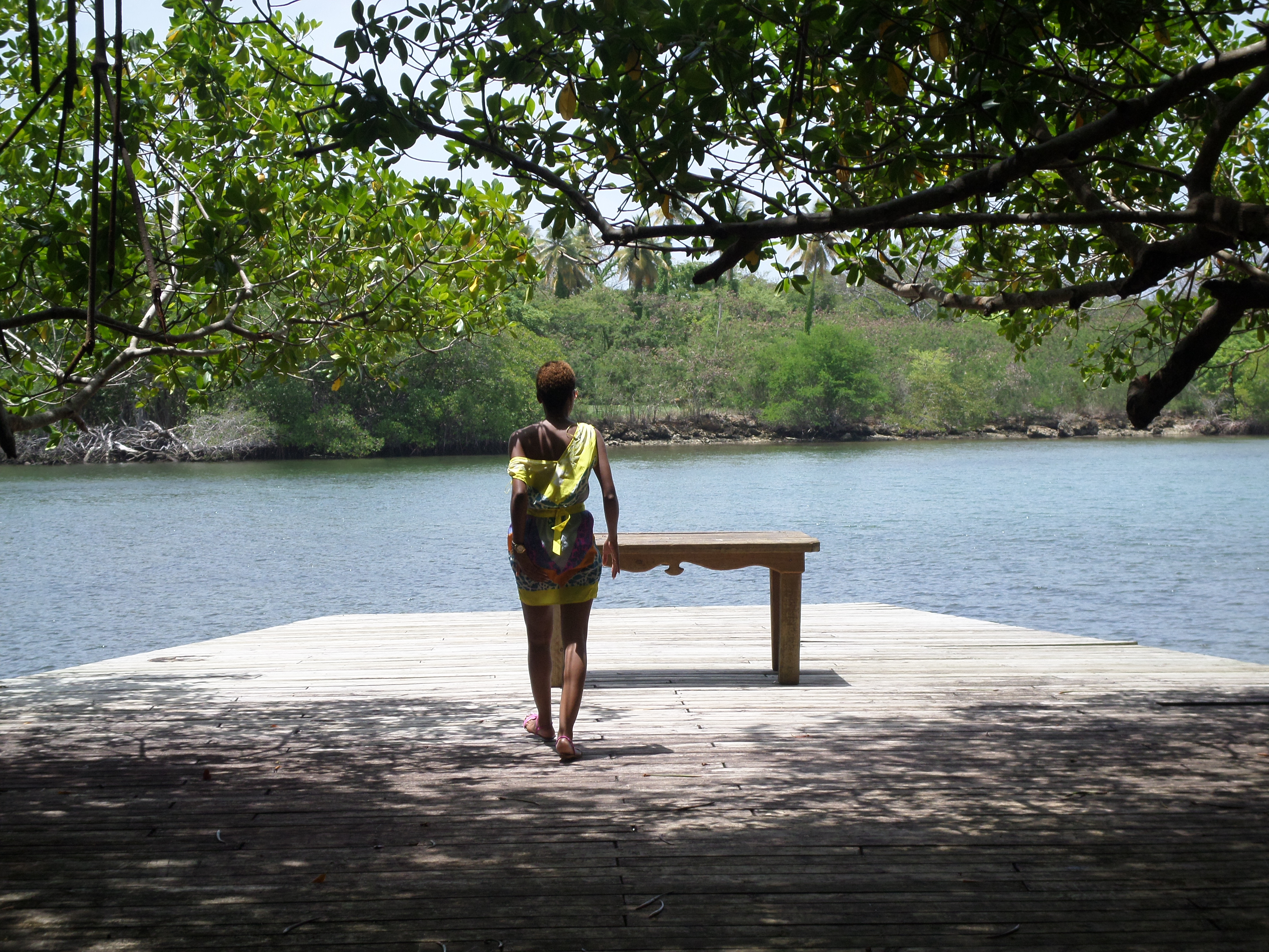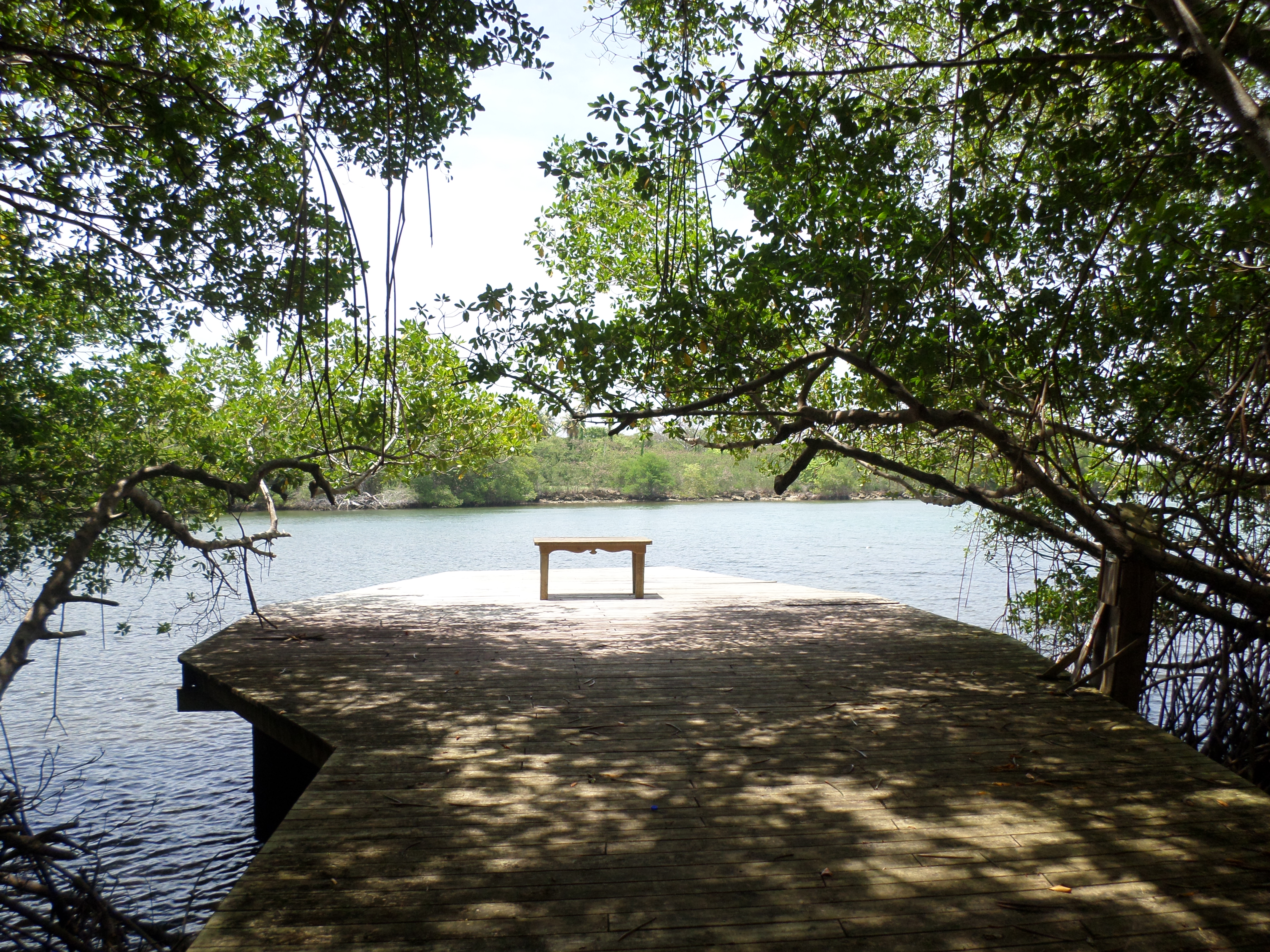 Thais and I had been exploring a vacant villa complex in the Tobago Plantations (extremely creepy by the way. I kept waiting for the zombies to emerge if we made too much noise) when we noticed a very Blair Witchish entrance (or what I would assume a Blair Witchish entrance would look like, as I hate suspense and horror and have watched few horror movies in my life) to a series of interconnected bridges through the mangrove. The bridges originated from multiple different points and converged into one path that led to a small hut, and a wide jetty with a bench overlooking a lagoon.